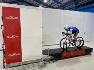 A table with a scale built for measuring drag of road bicycles. Designed for use with the Aero Optim wind tunnel units, it features a slim, portable build. Supports are currently compatible with thru-axles and quick-release axles.
